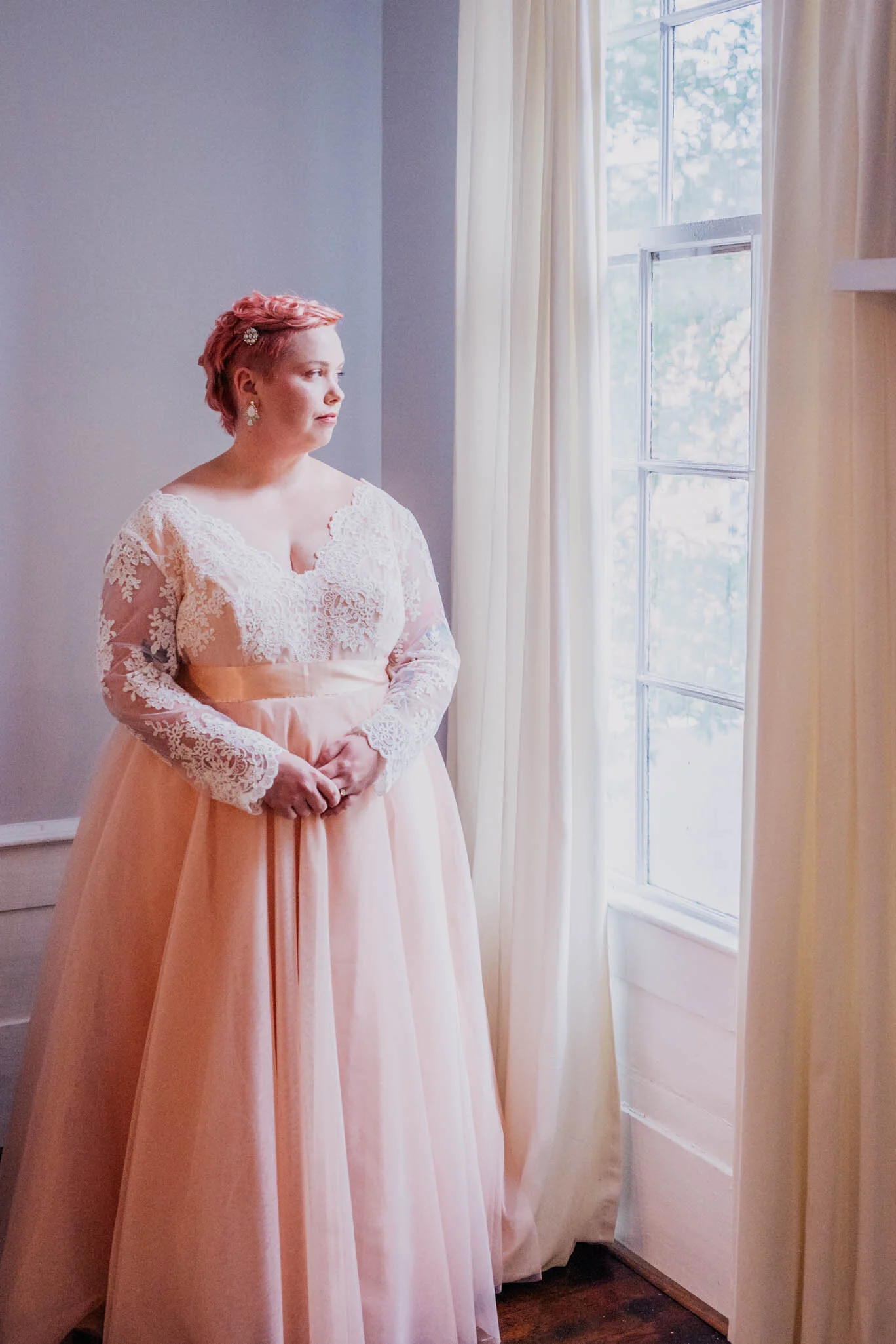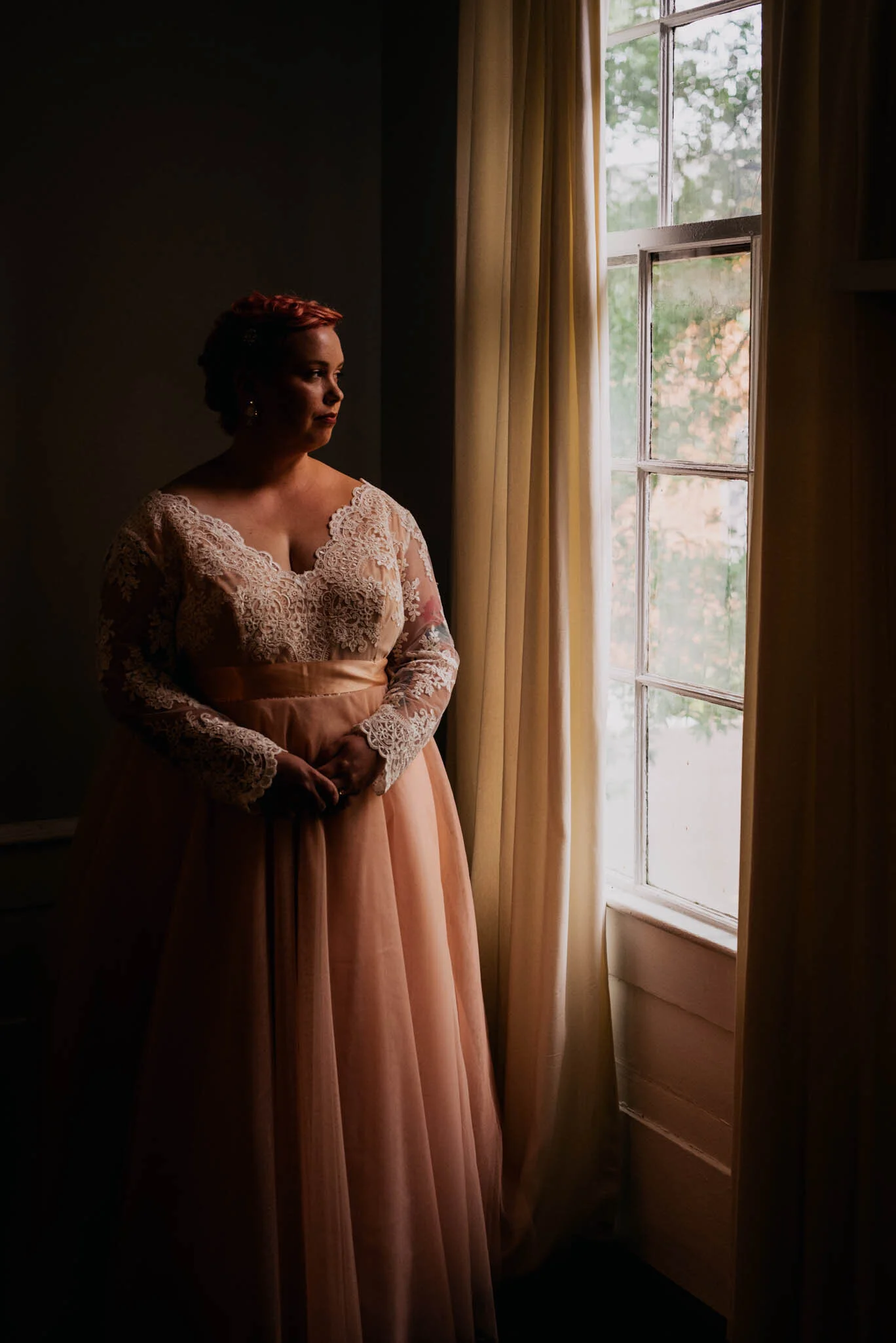 It’s a wedding day. People are naturally anxious to have so many people looking at them, dealing with family being a little crazy sometimes, maybe just all around nerves of this day of commitment. Or perhaps it’s just a moment of thought, a pause in an otherwise hectic day. The first photograph is more ethereal and fairytale-like. The colors are more flat and pastel and the mood is almost non-existent - it is simply pretty for the sake of pretty. While the second photograph is moody, raw and thoughtful. The lace is very apparent as is her tulle dress and the shadows help you to trace from her face down, or perhaps even from her face to her gaze out the window. Maybe you love the first over the second, or perhaps vice versa, neither is right or wrong - but for me and my heart the shadows always take my attention.