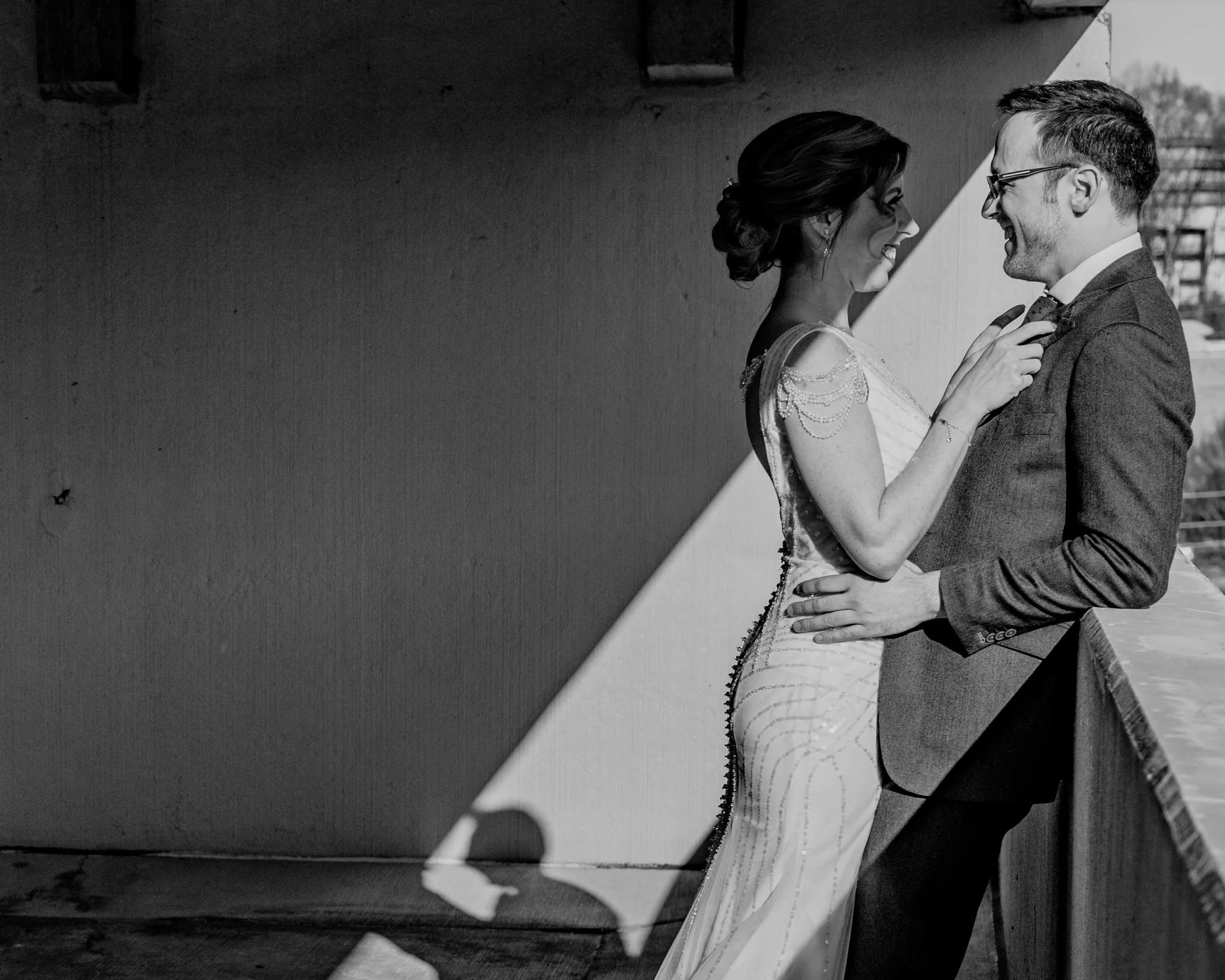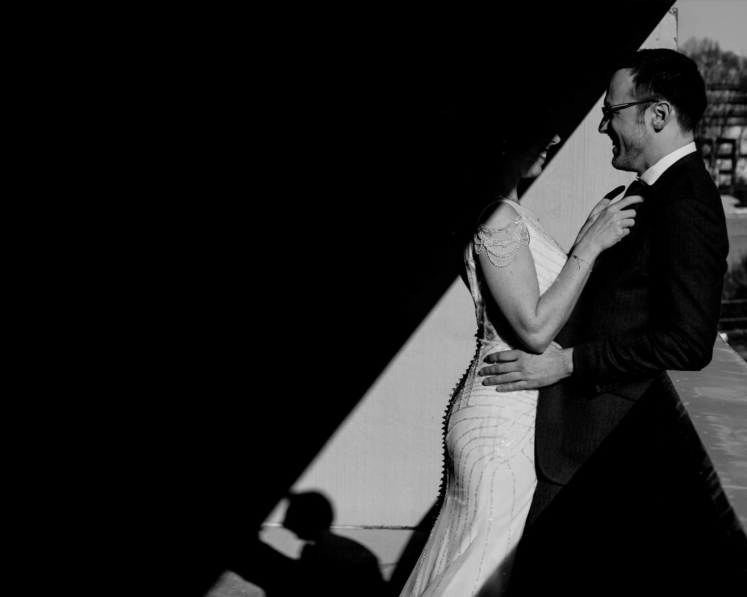 This is a great example of how shadows sculpt our vision, the feeling and even our imagination. In the first photograph, everything is very clear and straightforward - happy couple standing in a less than ideal setting in a parking garage. It’s not even pretty for the sake of pretty, it’s just a silly moment, but my eyes see the whole scene and there isn’t much to think about so I move on if I see this in my feed or even on a wall. Whereas in the second photograph, the shadow plays several crucial roles. First, it helps bring your attention directly to their faces as your eyes naturally follow the the edge of the shadow up. Secondly, it covers every bit of her face except her mouth. This adds a small mystery, maybe prompting the questions ‘is she making him laugh?’ or ‘is this just a sweet moment?’ We want to know what her face looks like, but we only know she is smiling. And lastly, the shadow adds dimension and interest to a space that is otherwise very plain by thoughtfully covering the back wall of this parking garage and having us think that this could be a balcony somewhere completely different